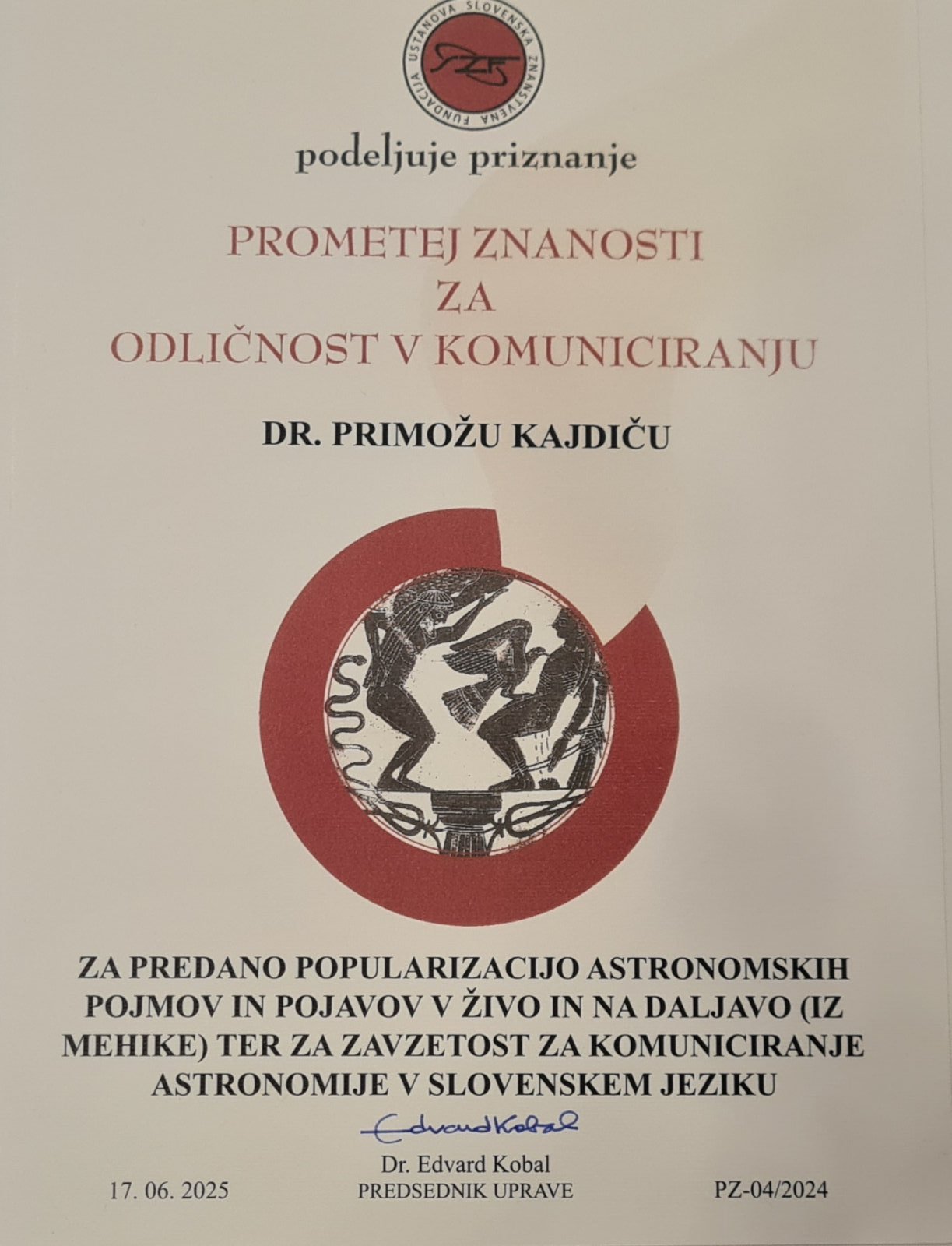 Doletela me je velika čast, da sem postal prejemnik nacionalnega priznanja Prometej znanosti za odličnost v komuniciranju na področju komuniciranja znanosti, ki ga podeljuje Slovenska znanstvena fundacija (SZF). Iskreno se zahvaljujem tako SZF, kot predlagateljema – Pomurski akademski znanstveni uniji – PAZU ter Fakulteti za naravoslovje in matematiko, Univerza v Mariboru. Še posebej pa se zahvaljujem vsem, ki spremljate Sončni blog in me tako spodbujate k udejstvovanju na področju popularizacije vesoljskih znanosti.