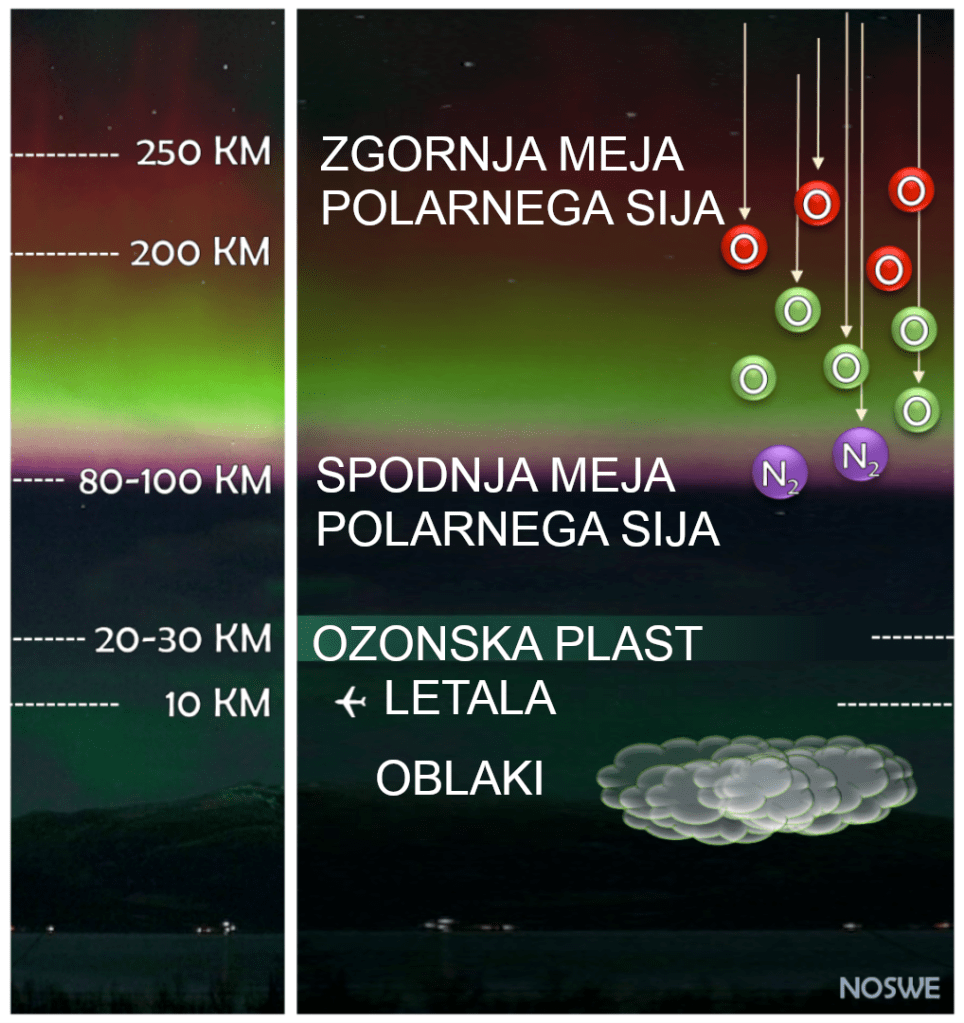 Rdeča: kisik na približno 300–400 km (pri močnih aurorah).