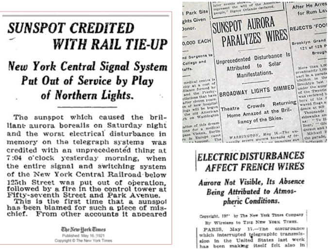 Maja leta 1921 so Zemljo dosegli kar štirje medplanetarni izbruhi koronalne snovi[2], ki so v smrtno nevarnost spravili človeška življenja. Indeks Dst, s katerim merimo moč geomagnetnih neviht je bil pozneje ocenjen na -907 nanoTesel.