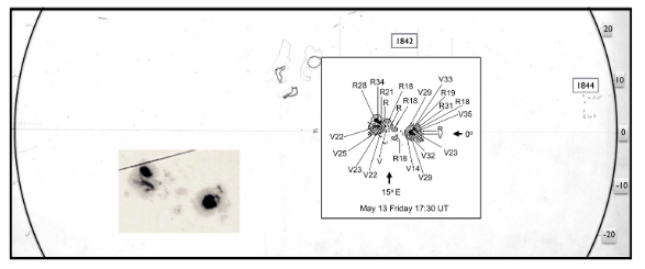 Prva izbruha sta prispela 13. maja ob 13:10 in 19:24 po Greenwiškem času. Taistega dne zvečer je nad Evropo zasijal močan polarni sij, ki so ga opazili v Anglji, Franciji, Nemčji, Španiji, Walesu in drugje. Poročila o močne siju so prihajala tudi iz ZDA in Avstralije. Geomagnetna nevihta je prekinila telekomunikacije na Danskem in na Švedskem, v ZDA in Avstraliji pa je prekinila telegrafske povezave.