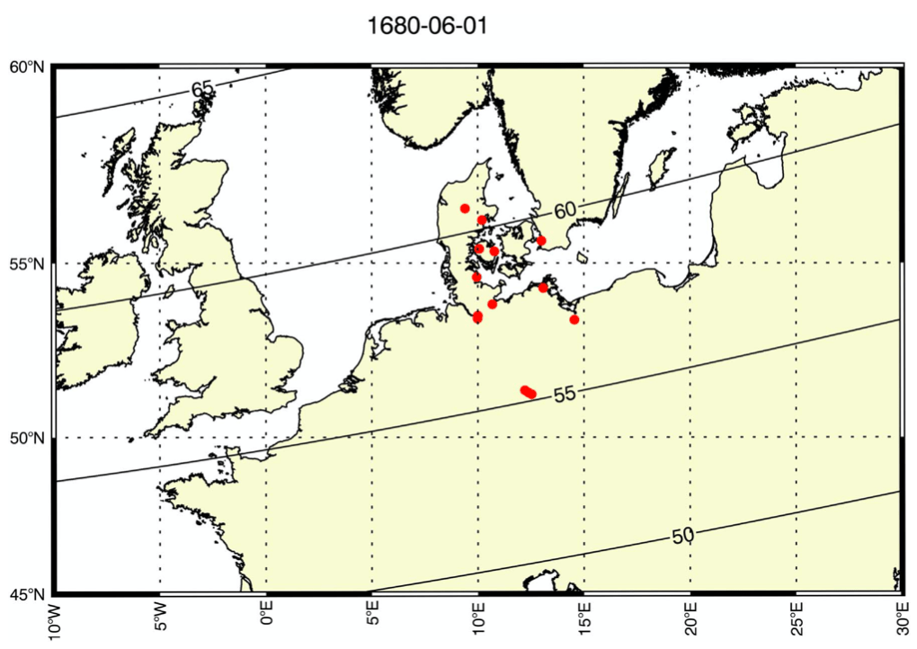 Na Sliki levo spodaj so z rdečimi pikami označeni kraji od koder imamo pričevanja o videnju polarnega sija. Na srednji pa je polarni sij narisal Kirch, pri čemer se je naslanjal na pričevanja iz okolice Lübecka.
