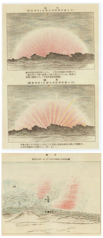 Na spodnji sliki levo lahko vidimo kje vse so bile vidni polarni siji tekom teh treh dogodkov, medtem ko pa desna slika prikazuje risbe, ki prikazujejo polarni sij, kot je bil viden na Japonskem 22. januarja 1938.