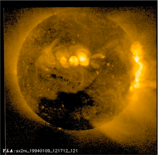 Zanimivo je, da tokrat geomagnetne nevihte ni povzročil izbruh koronalne snovi. Njen vzrok je bila hitra struja Sončevega vetra, katere hitrost je bila 700 km/s. Izvor te struje je lepo viden na posnetku Sonca, ki ga je v rengentski svetlobi naredila Sonda Yohkoh (spodaj). Okoli južnega pola lahko vidimo temno območje, ki mu pravimo koronalna luknja. Ta območja so vir hitrega Sončevega vetra. Prikazana koronalna luknja se je raztezala skoraj do sončevega ekvatorja, zato je, ko je bila obrnjena proti Zemlji, proti načemu planetu začel potovati hiter Sončev veter. Ta veter je bil izvor visokoenergijskih elektronov z energijami večjimi od 2 megaelektronvolta (MeV), ki lahko poškodujejo satelite oziroma elektronske inštrumente na njih.