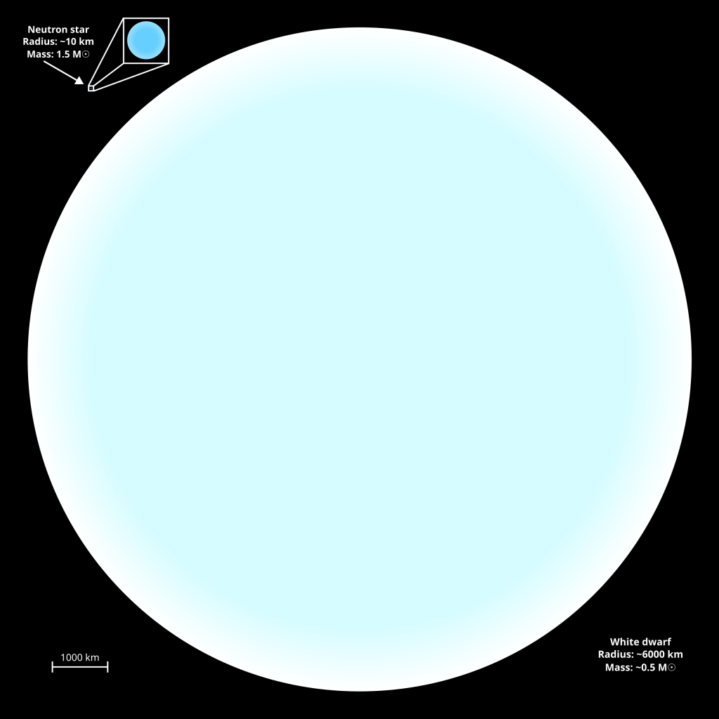 Primerjava velikosti nevtronske zvezde z velikostjo belih pritlikavk, ki so po velikosti podobne Zemlji. Vir: Wikipedia.