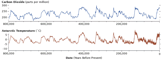 Koncentracijo CO2 v ozračju lahko iz vzorcev polarnega ledu neposredno izmerimo za preteklih 800.000 let. Spodnja slika[1] prikazuje kako sta se tekom tega obdobja spreminjala temperatura ozračja na Antarktiki in koncentracija CO2. Vidimo, da sta obe količini zelo povezani. Povečanje (zmanjšanje) koncentracije CO2 povzroči zvišanje (znižanje) povprečne globalne temperature.