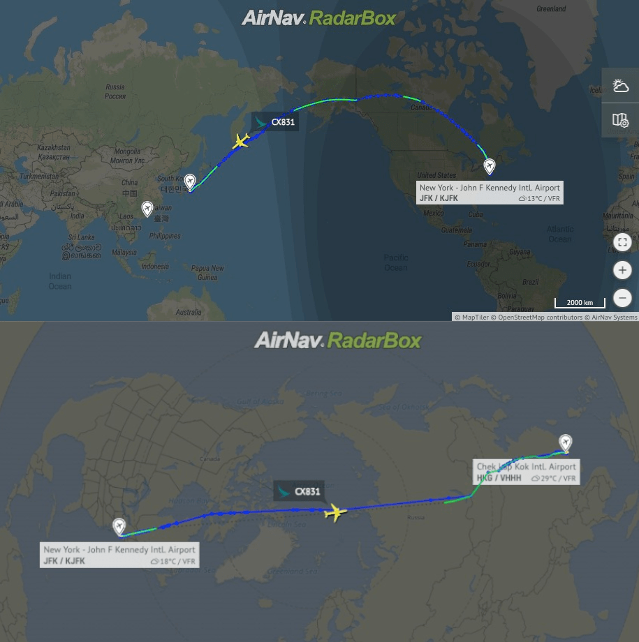 Zgoraj: Pot leta CX831 dne 9. oktobra 2024. Spodaj: Običajna trasa taistega leta.