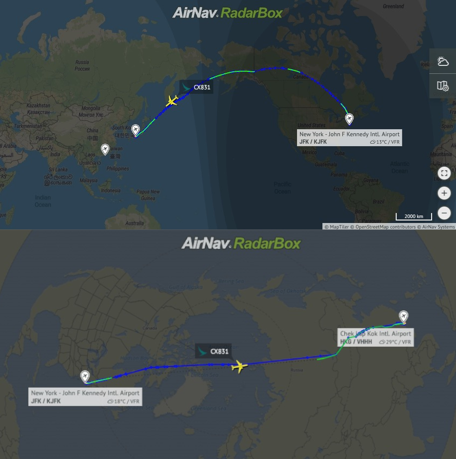 Zgoraj: Pot leta CX831 dne 9. oktobra 2024. Spodaj: Običajna trasa taistega leta.