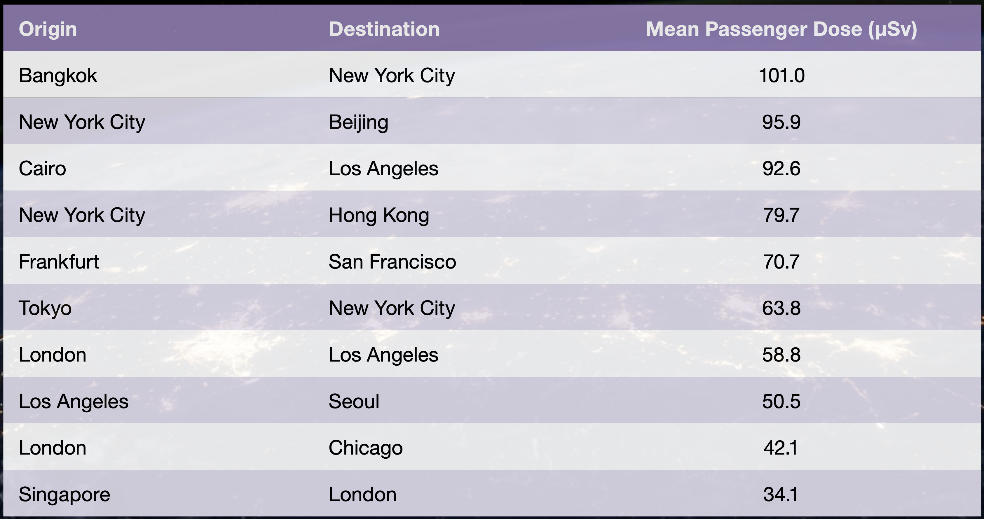 Dejansko so potniki in člani posadke nevidnemu sevanju izpostavljeni med vsakim poletom, to pa lahko predstavlja tveganje, ki pa še ni povsem razumljeno. Največja izpostavljenost nastopi pri dolgih letih, ki se odvijajo na velikih višinah, še posebej nad polarnimi območji.