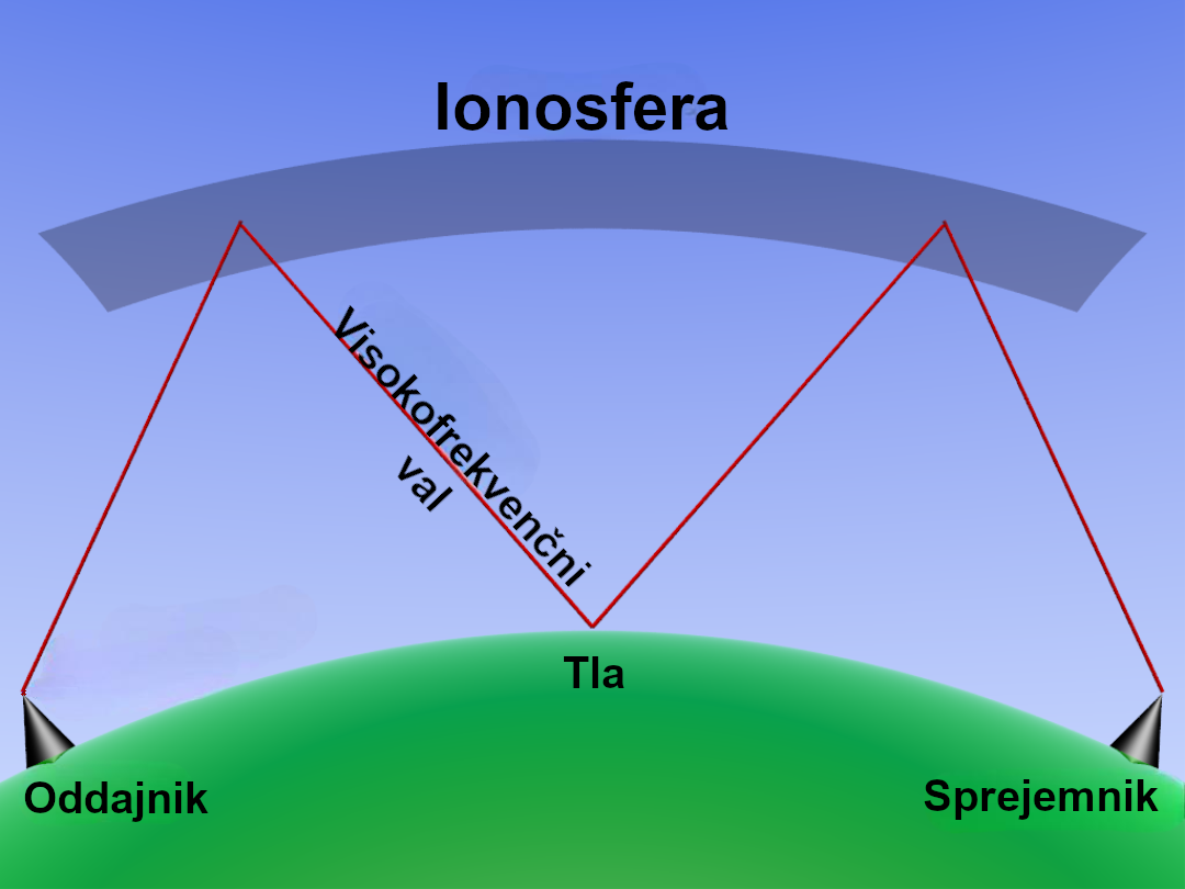 Propagacija visokofrekvenčnih (HF) radijskih valov. Vir: Wikipedia.