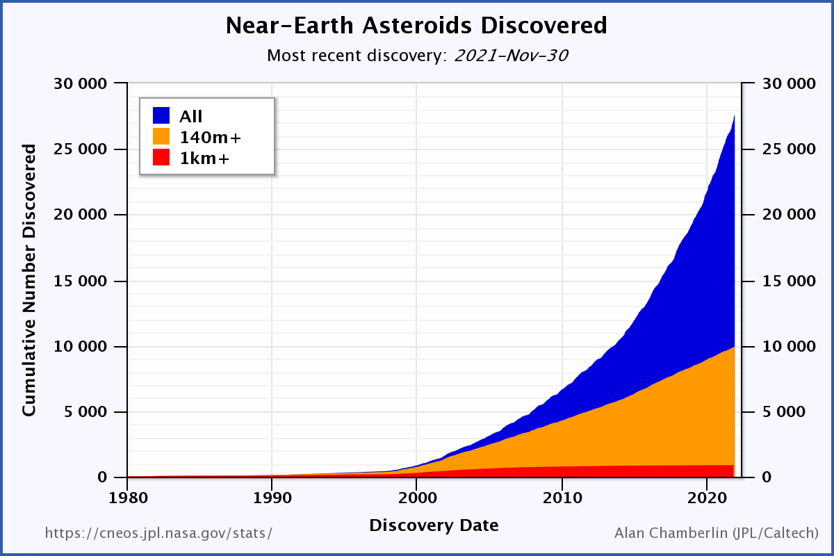 Večina objektov NEO ima velikosti med 30 in 100 metri, le kakih 900 pa je večjih od kilometra. Medtem, ko število novoodkritih objektov manjših od 140 metrov še vedno strmo narašča, pa se ocenjuje, da je bilo do danes odkritih že več kot 90 % vseh objektov NEO z velikostjo nad 1000 metrov.
