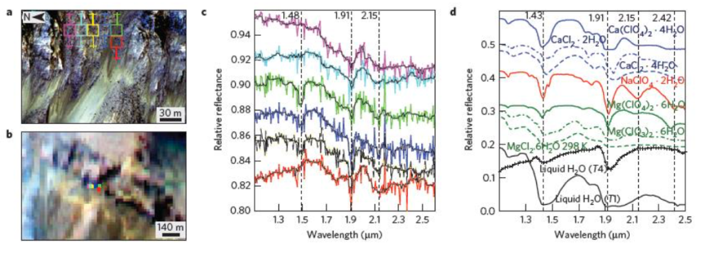 Slika 5d prikazuje odbojnost delov površja, ki so označeni na sliki 5a in se nahajajo v kraterju Palikir. Tam, kjer se ta odbojnost nenadoma zmanjša, bi v spektru opazili absorpcijske črte. Le-te so bile izmerjene pri valovnih dolžinah ~ 1.48μm, 1.91μm ter ~3μm in sicer proti koncu južnega poletja. Te črte nakazujejo na obstoj vodnih raztopin magnezijevega, kalcijevega ter natrijevega klorata. Podobne spektre so znanstveniki izmerili še na preostalih treh območjih. S tem so nedvomno potrdili tezo, da strukture RSL nastanejo zato, ker se v toplih obdobjih po njih pretaka slanica, torej vodna raztopina različnih soli, to pa pomeni obstoj tekoče vode na Marsu.